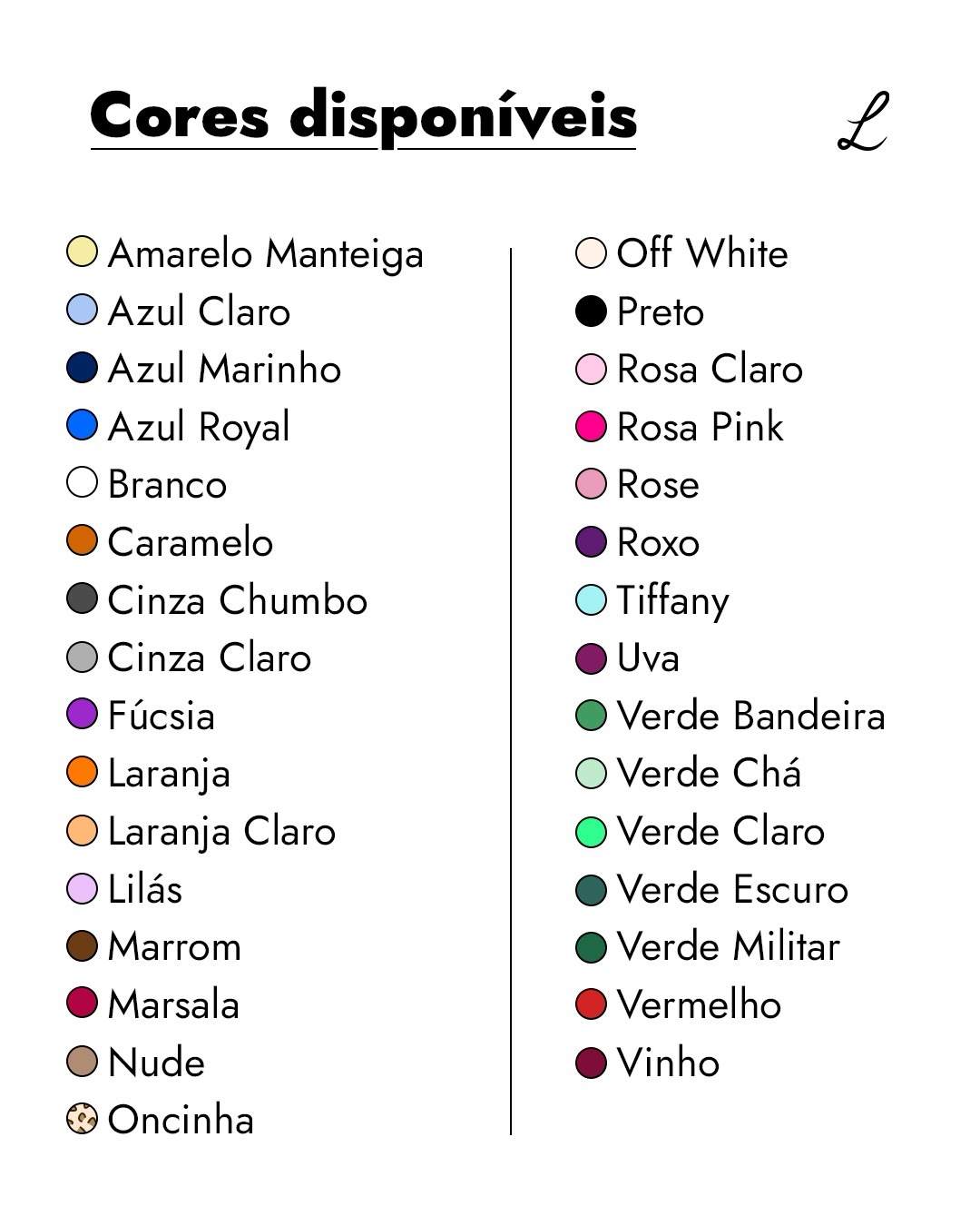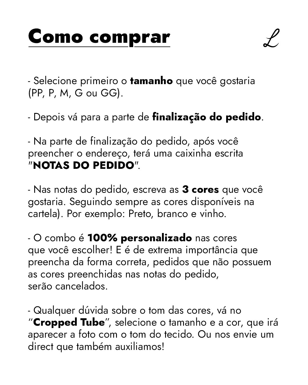 - Qualquer dúvida sobre o tom das cores disponíveis, vá no “Cropped Long” no site, que lá irá ter a foto de todas as cores